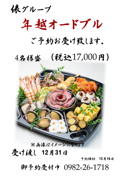 お知らせ 年越しオードブルのご予約について 2025/10/03 こんにちは!俵グループの俵ん子です。当店では年越しに向けたオードブルのご予約受付を開始いたします。ご予約締め切りは12月16日までになります。※画像は4名様用で、イメージです。 NoNews 次へ